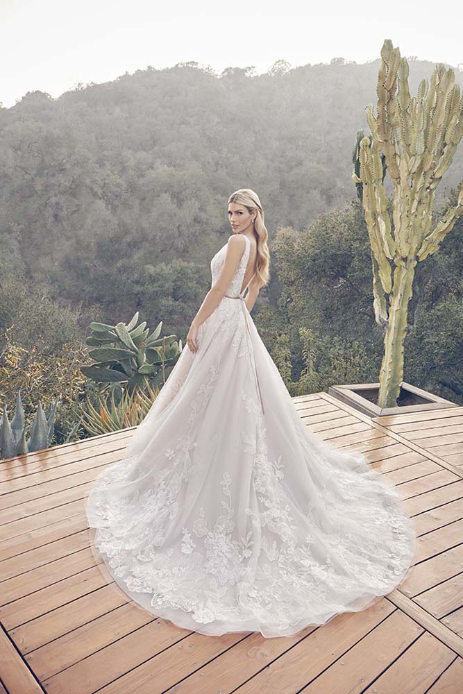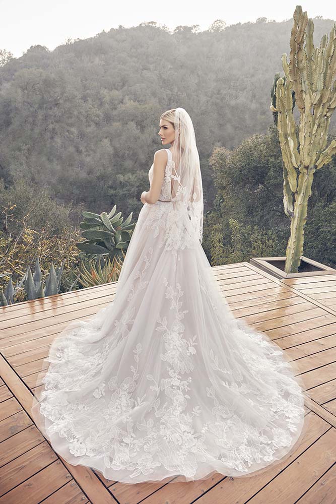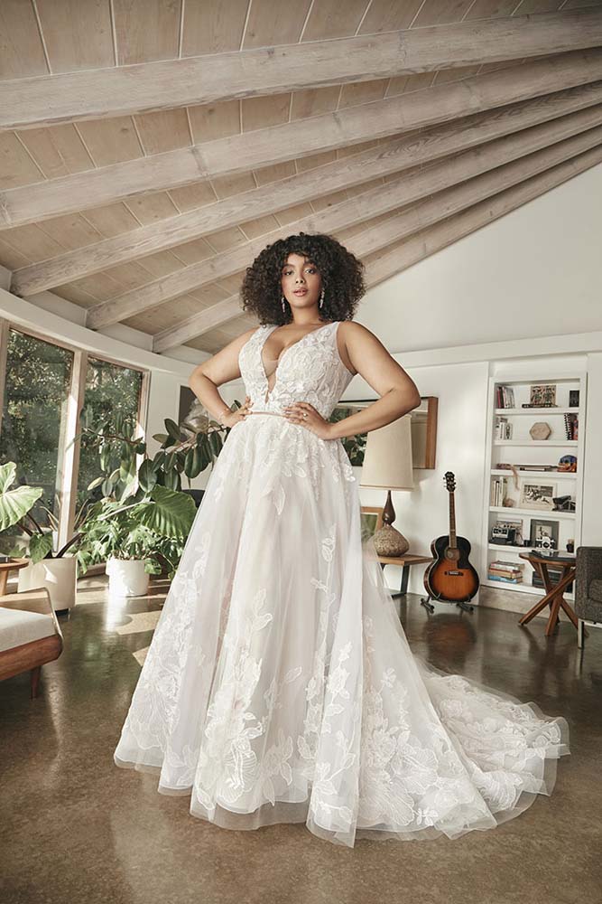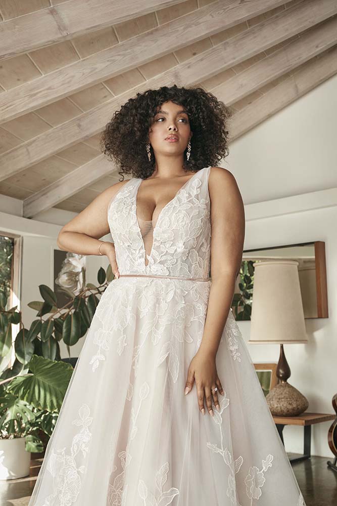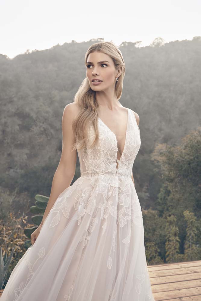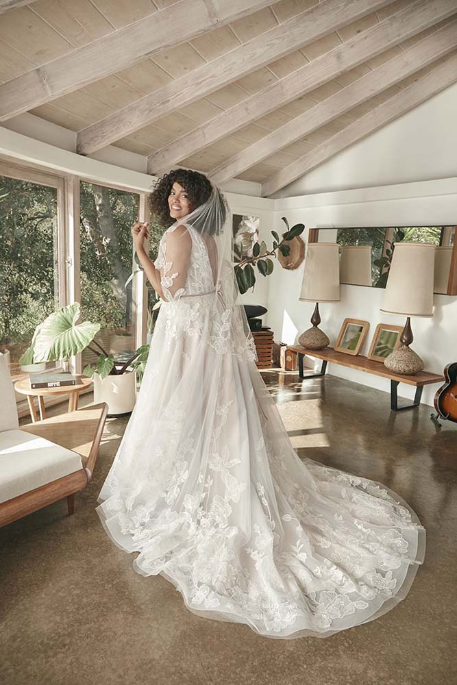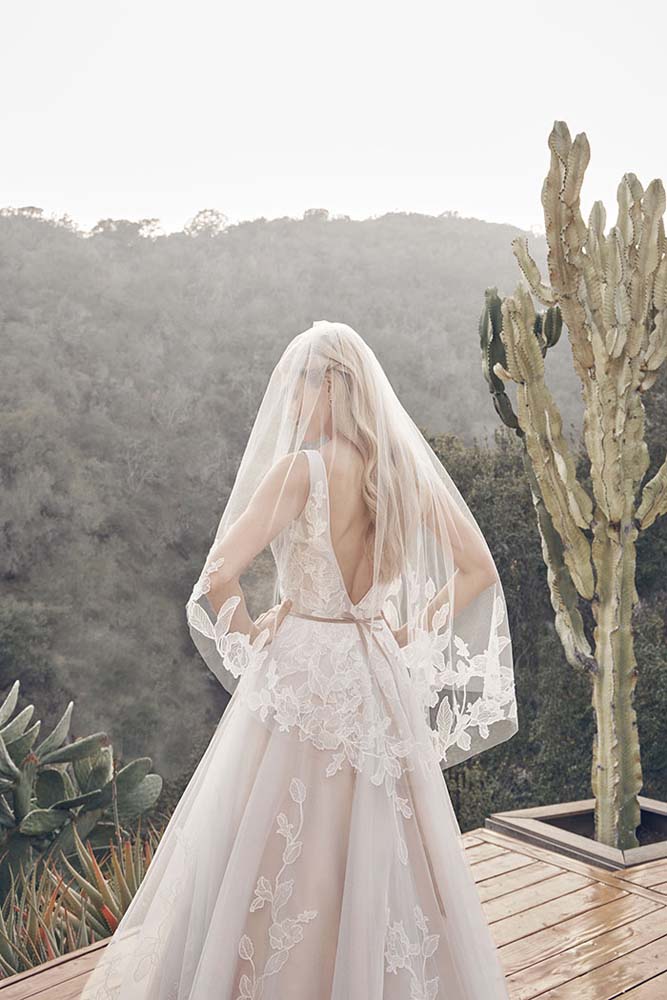 Enchanting, elegant, and effortlessly chic, Style BL395 Sophie by Beloved is a portrait of feminine beauty. Inspired by sparkling dewdrops atop fresh flowers, a floral overlace with sequins blooms across the bodice of this timeless A-line silhouette. Playful tulle straps trace a sultry plunging V-neckline and low v-back, while a delicate velvet sash adds a touch of sweetness. Pairs perfectly with Sophie's coordinating viel BL395V for an impression that's as everlasting as your love.