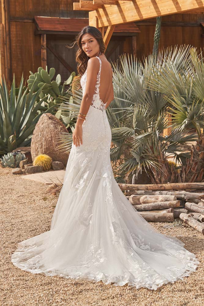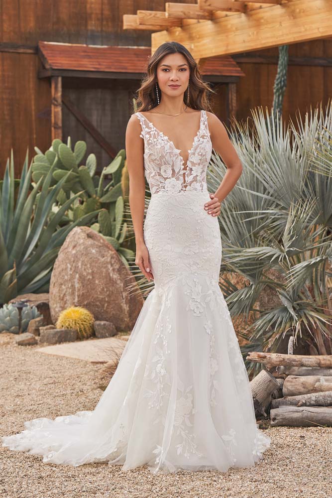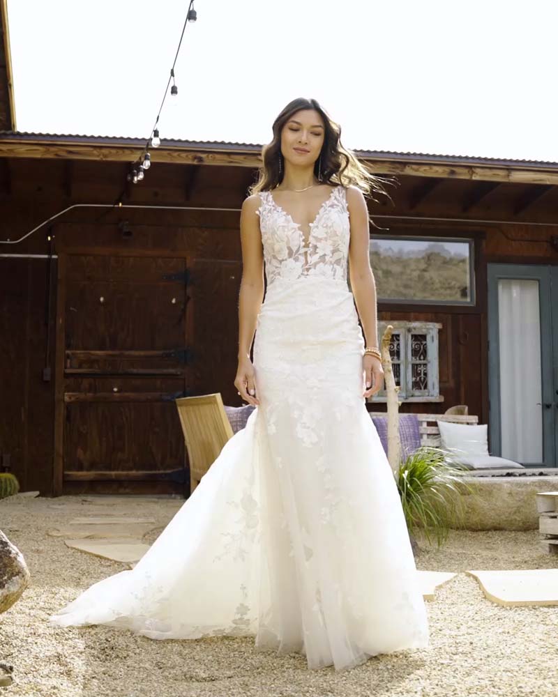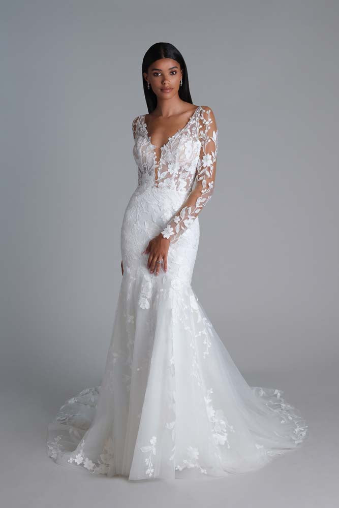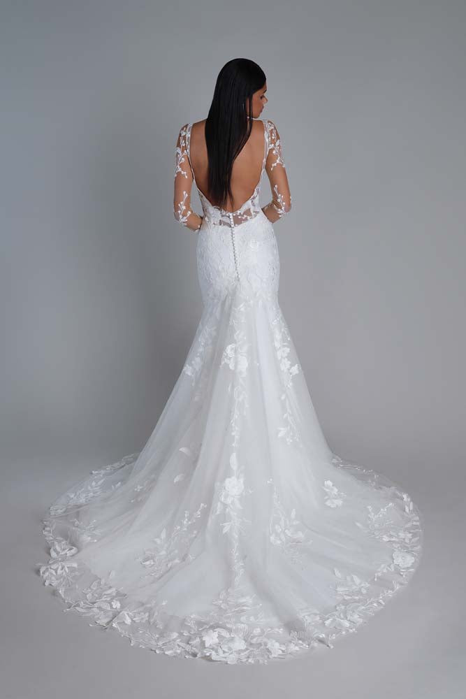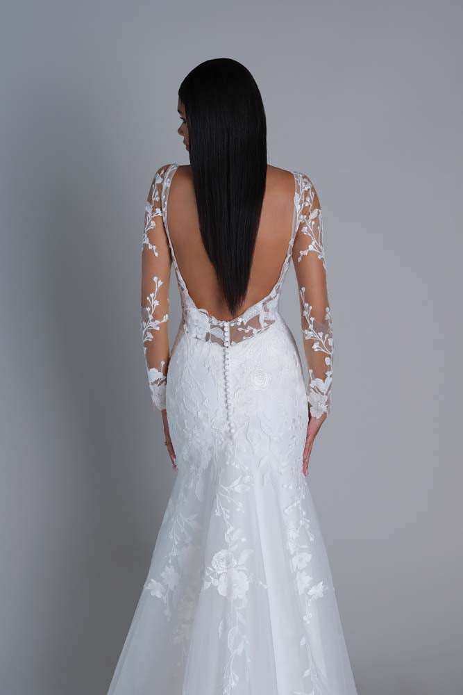 Feel adventurous in this body contouring trumpet bridal dress. The sheer bodice offers a sexy plunging V-neckline paired with a stunning scoop back. The gown features a sparkly dotted glitter tulle that acts as the perfect underlay for the matte cotton lace appliqués. With a chapel length train, glittering tulle buttons accent the back bodice. If preferred, this style can also be ordered with the bodice lined to the side seams. Matching detachable long sleeves are also available, sold separately.