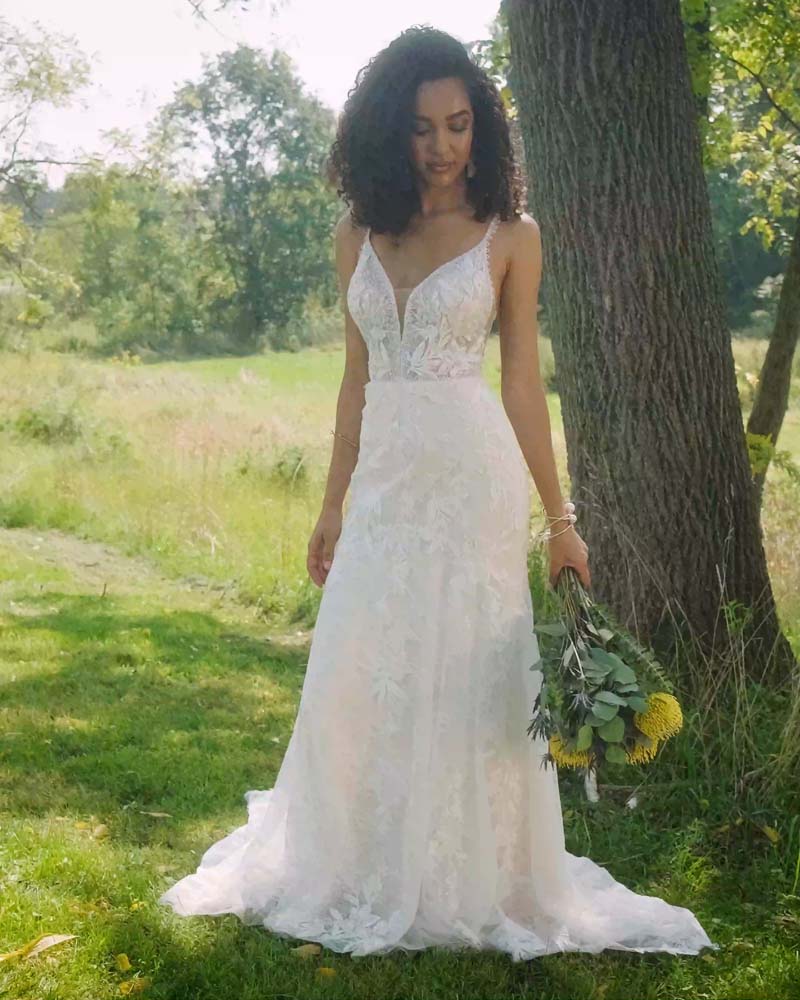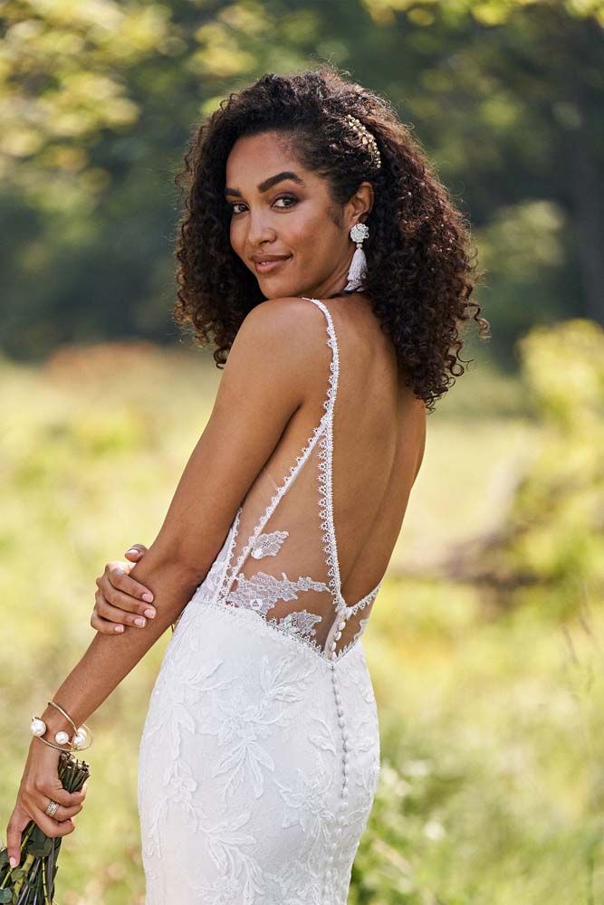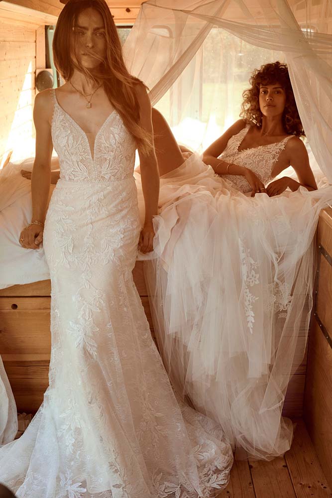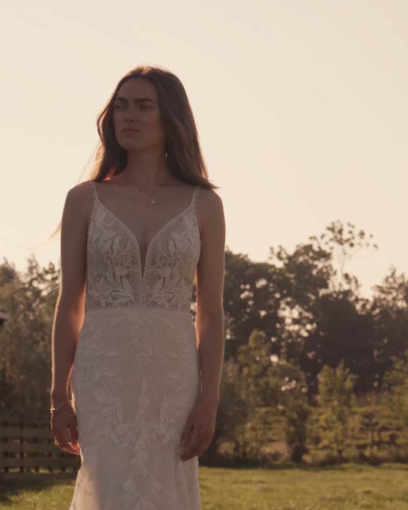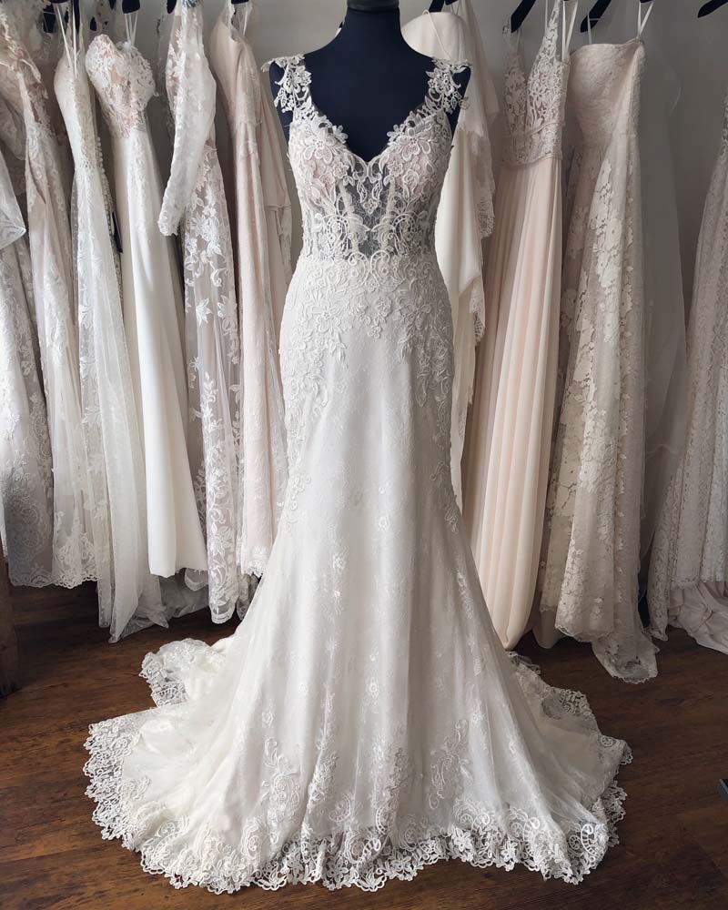 This lace trumpet bridal dress is for the casual and cool bride. The plunging bikini neckline is accented with V-side cutouts that lead to a sexy and low V-back. The gown is adorned with an allover Chantilly lace blended with embroidered appliqués placed over top. Lace trims detail the neckline and waist for a flattering effect. It's finished with a soft and stretchy jersey lining and a stunning scalloped chapel length train.
