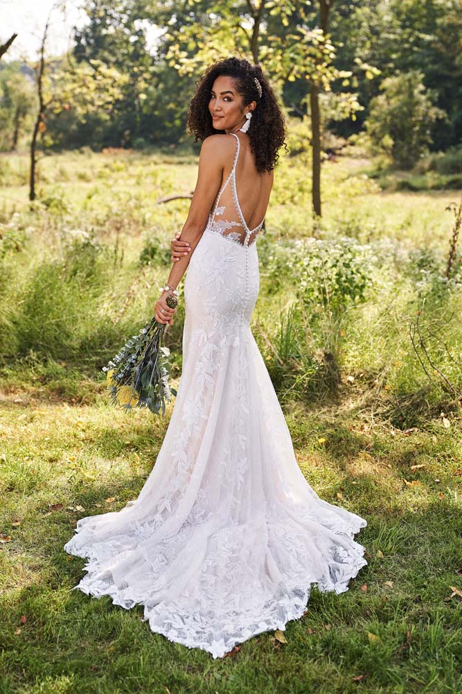 Lace Trumpet Gown with Low Back and Scalloped Chapel Length Train.