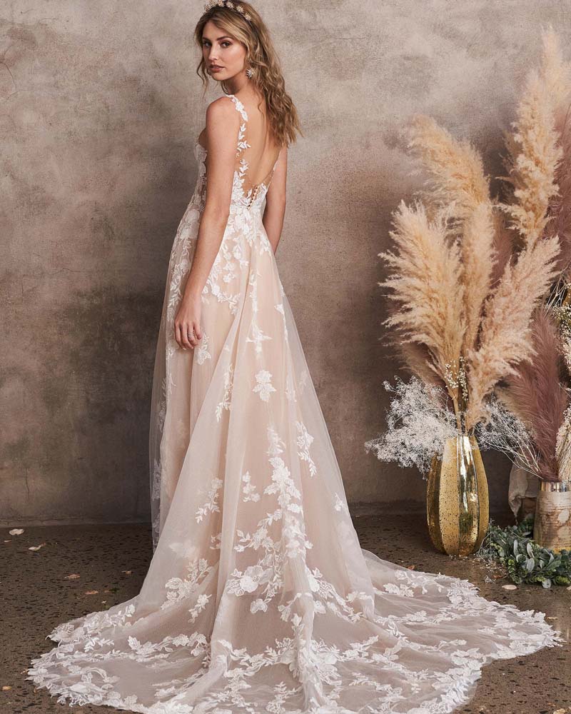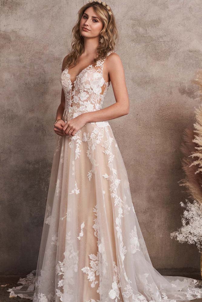 Shine through your day wearing this modern tulle and lace A-line bridal dress. The sexy plunging V-neck is detailed with tonal beading while illusion side insets lead to an illusion V-back. Beaded and sequined lace appliqués add a touch of whimsy from the bodice to the the hem while an underlayer of glitter tulle acts as the perfect shimmering canvas. The back reveals a unique petal train detailed with lace as the final wow-factor. For more coverage and structure, this style is also available with the front bodice lined to the side illusion insets.