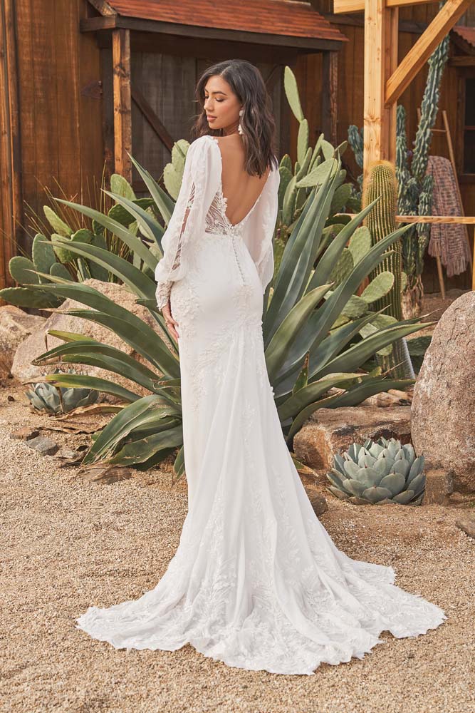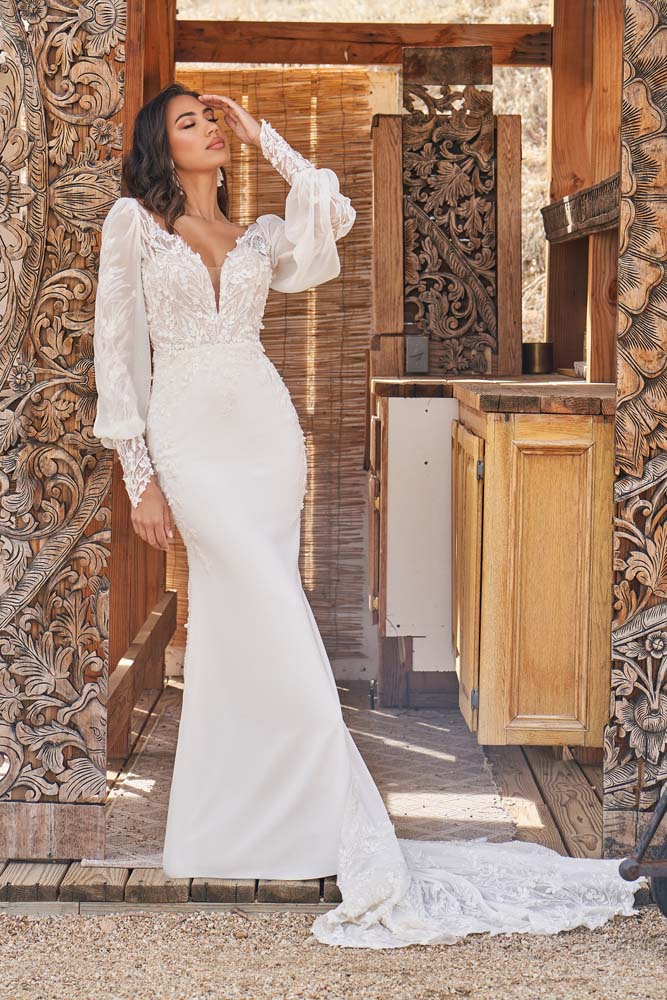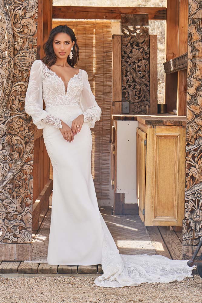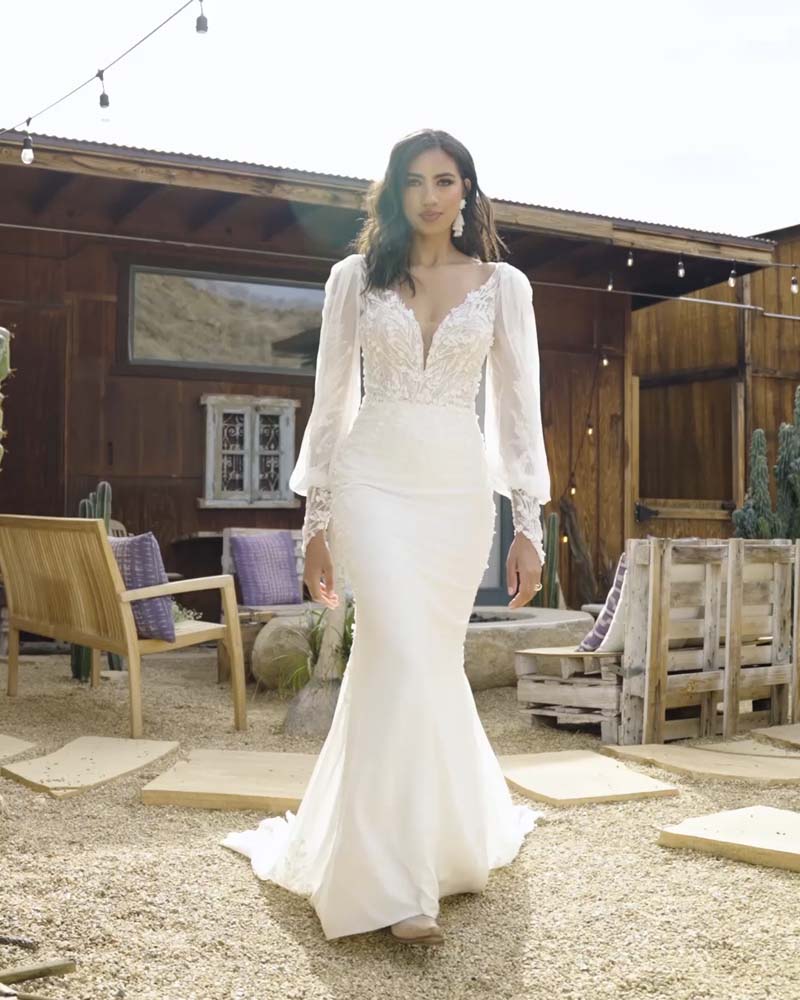 This unexpected fit and flare bridal dress gives off an ethereal romance. The plunging V-neck is accented with illusion straps that lead to a low V-back. Tonal beaded and sequined appliqués add modern detailing while 3D chiffon petals float over top to create soft texture with an organic feeling. The sculpted stretch crepe skirt is set off with a chiffon godet on the back, forming a romantic petal shaped chapel length train. The style is paired with on-trend long sleeves that feature a detachable chiffon blouson detail. The sleeves are sold separately.