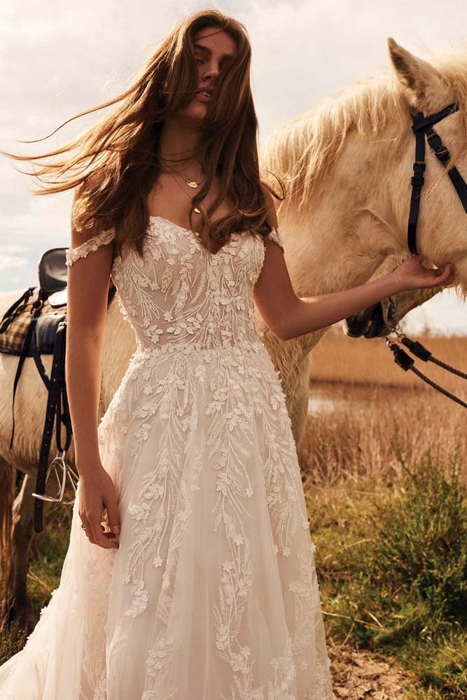 Beaded and sequined laces are blended with dimensional laser cut chiffon flowers to create this whimsical wedding gown. Featuring an illusion bodice, a sweetheart neckline with delicate off-the-shoulder straps, and an open V-back. Soft layers of tulle and organza create the light A-line skirt with a chapel length train. This style is also available with the front bodice lined to the side seams.