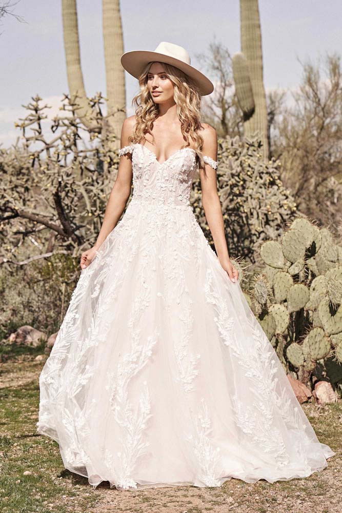 Off-the-Shoulder A-Line Gown with Dimensional Lace