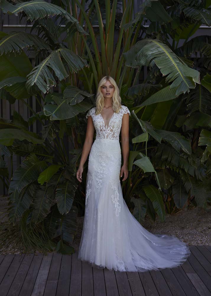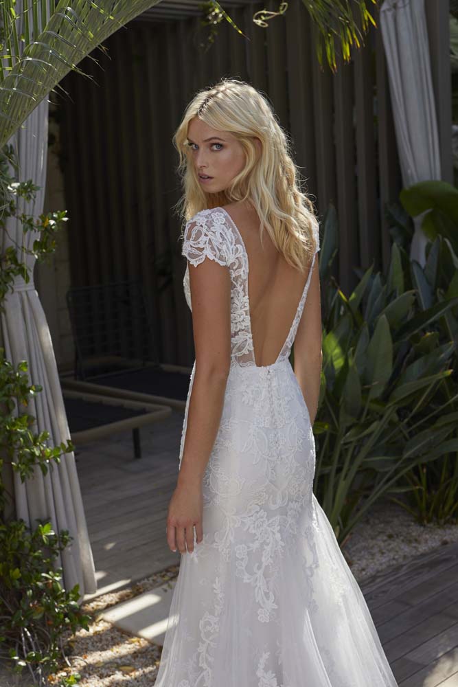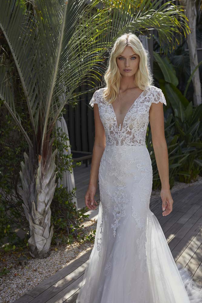 Fit and flare wedding dress Natasha has all the details a bride could wish for. The stunning illusion lace bodice features a seductive plunging V-neckline and modern cap sleeves. The embroidered lace with sequins placed throughout the tulle skirt will make you shine bright on your wedding day. The open back completes this feminine and sophisticated bridal look. This dress is also available with a regular tulle skirt – Natasha-A.