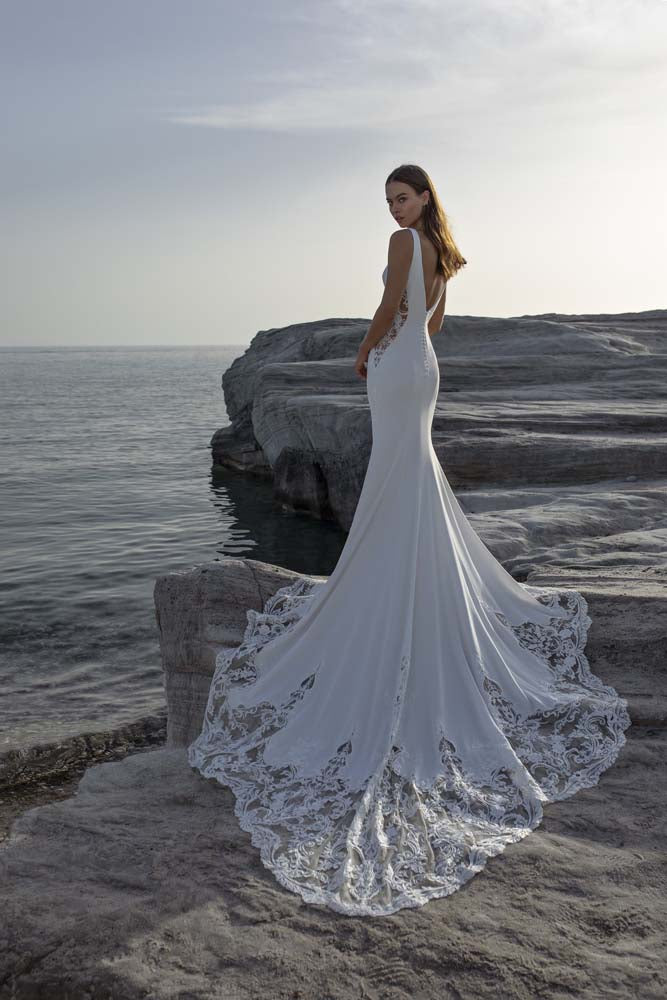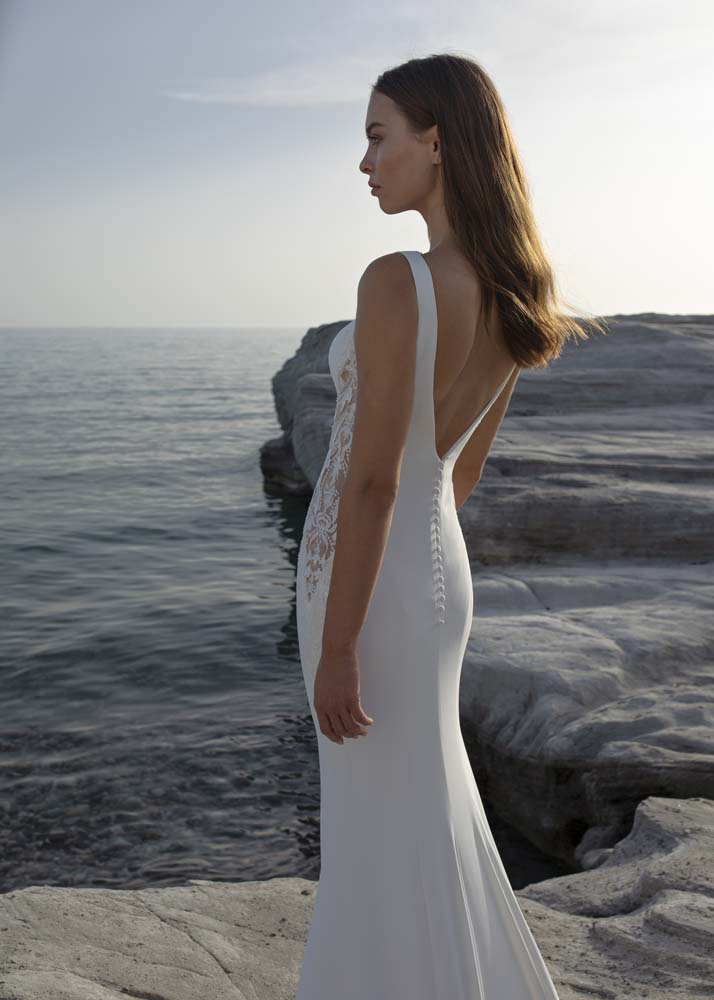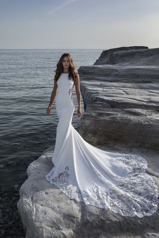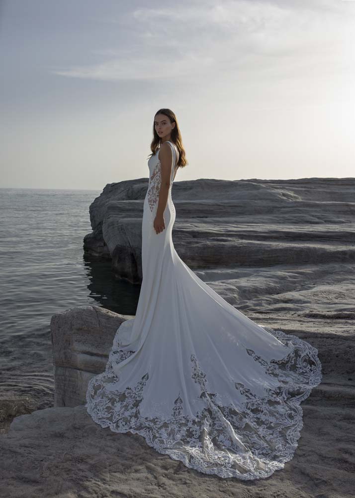 Our wedding dress Orla is designed for the most glamorous brides! This fit and flare gown is the perfect combination of crepe and lace. The standout design features stunning illusion side cutouts that lead into an elegant V-backline. The gown is finished with a stunning shaped train. If you’re looking for a classic look, this style is also available with the side cutouts lined.