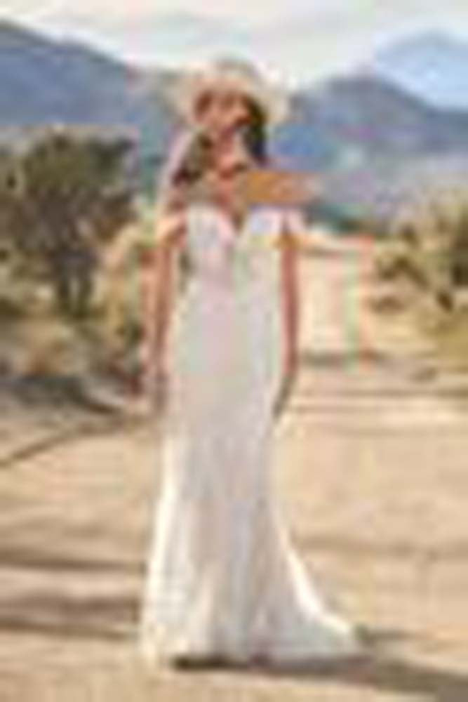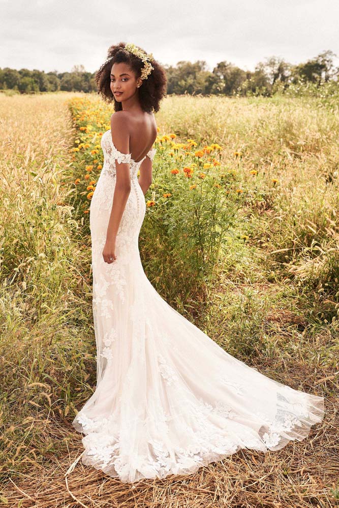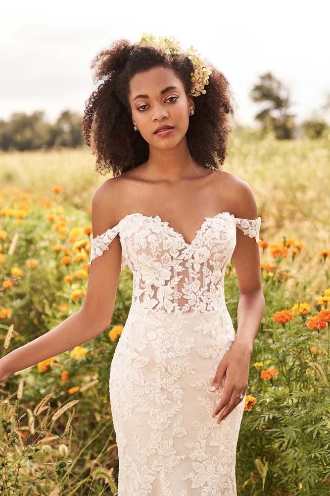 Organic and ethereal, this contouring fit and flare bridal dress will make you feel your best. Detachable off the shoulder straps complement the sweetheart neckline while the illusion bodice reveals sexy exposed boning. Feminine beaded floral appliqués cascade down to finish the tulle skirt and chapel length train. For a more traditional look, this style is available with the bodice lined to the side seams.