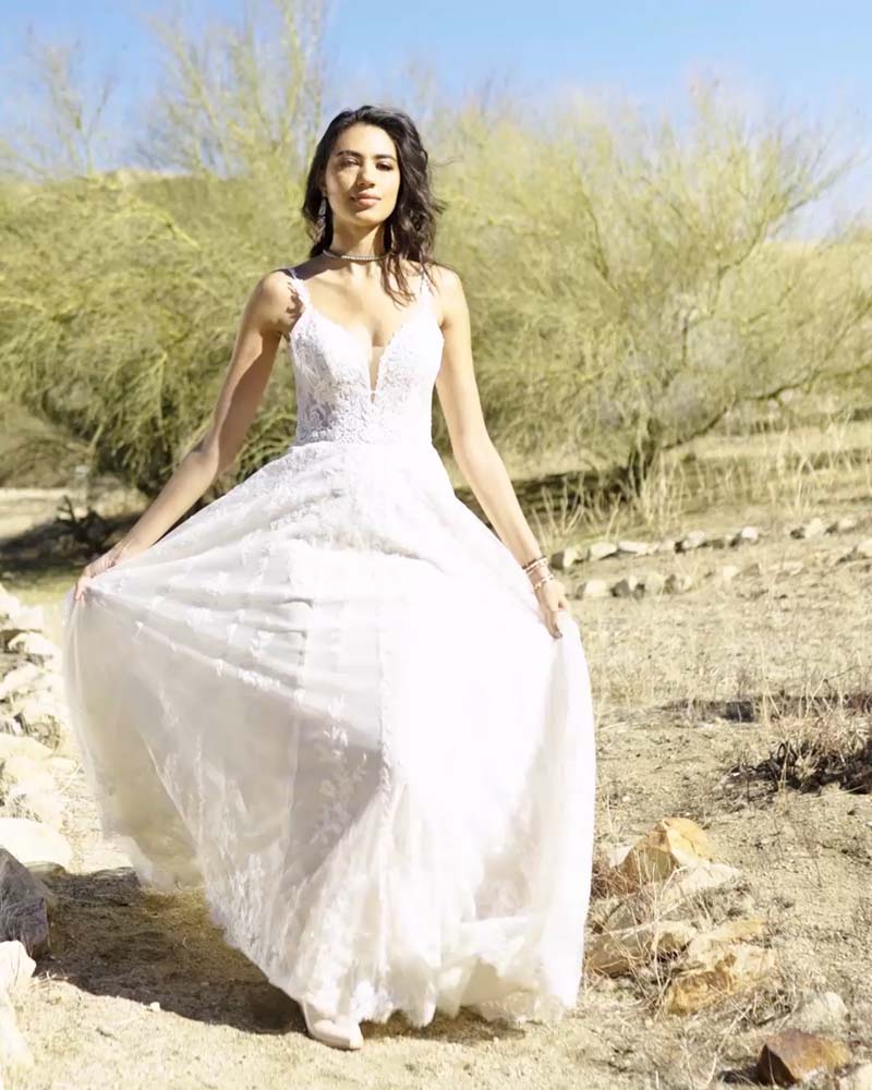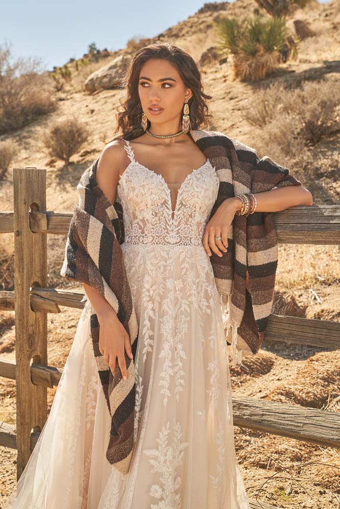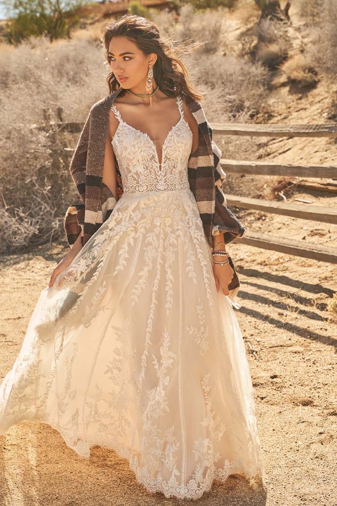 Organic laces turn this lightweight bridal dress into a dream. The tulle A-line skirt is paired with a plunging V-neckline accented with thin straps that lead to a low V-back. The sheer bodice is textured with sequined lace appliqués that trickle down and blend with vertically placed trim laces on the skirt. Scalloped eyelash trim defines the natural waist before continuing down to finish off the hem. A flowy chapel length train completes the look. For more coverage, this style can also be ordered with the bodice lined to the side seams.